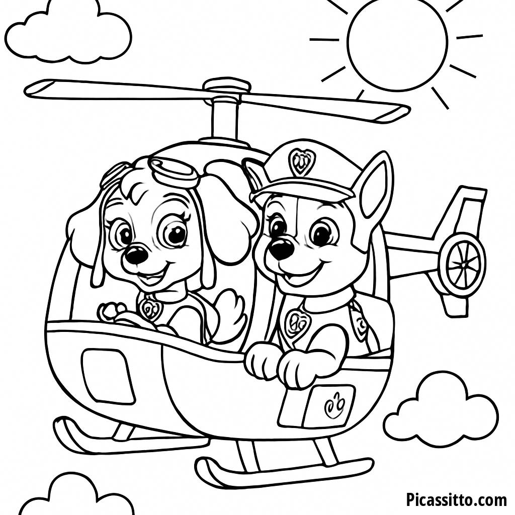 Divertiti con questa pagina da colorare gratuita e stampabile che presenta Chase e Skye in volo su un elicottero tra nuvole soffici e un sole luminoso. Perfetta per i piccoli fan di Paw Patrol!
