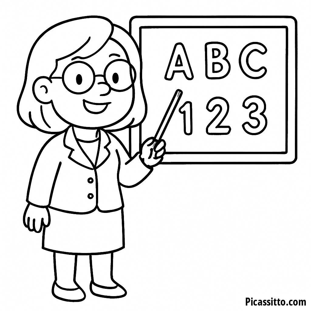 Scarica gratuitamente questa pagina da colorare della maestra allegra, con una felice insegnante che indica una lavagna piena di lettere e numeri!