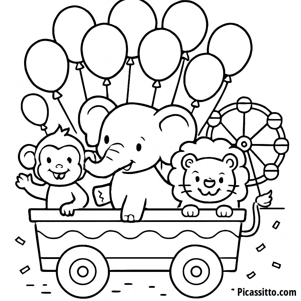 Goditi questa pagina da colorare gratuita e stampabile con un colorato carro allegorico, palloncini e animali giocosi. Perfetta per stimolare la creatività nei bambini!