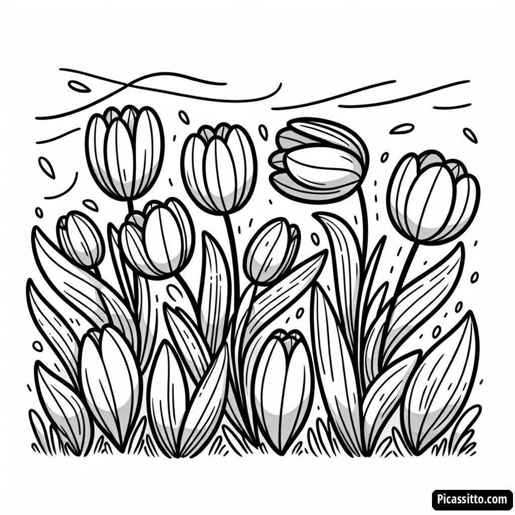 Goditi questa pagina da colorare gratuita e stampabile con tulipani colorati che ondeggiano nella dolce brezza, perfetta per far esplorare la creatività ai bambini!