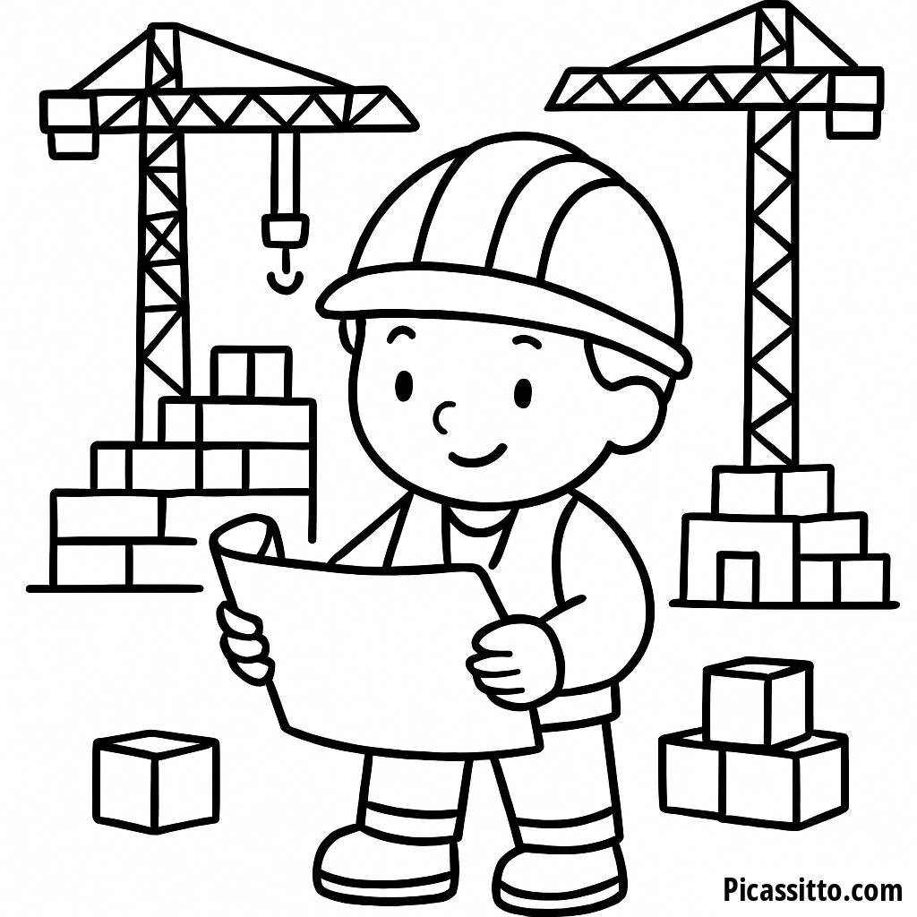 Scarica questa pagina da colorare gratuita del lavoratore edile con progetti e gru intorno! Perfetta per i piccoli costruttori.