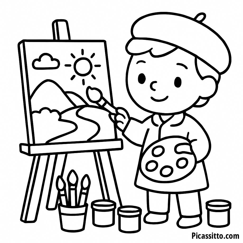 Scarica questa pagina da colorare gratuita e stampabile che presenta un artista che dipinge un paesaggio colorato su un cavalletto, circondato da pennelli e barattoli di vernice.