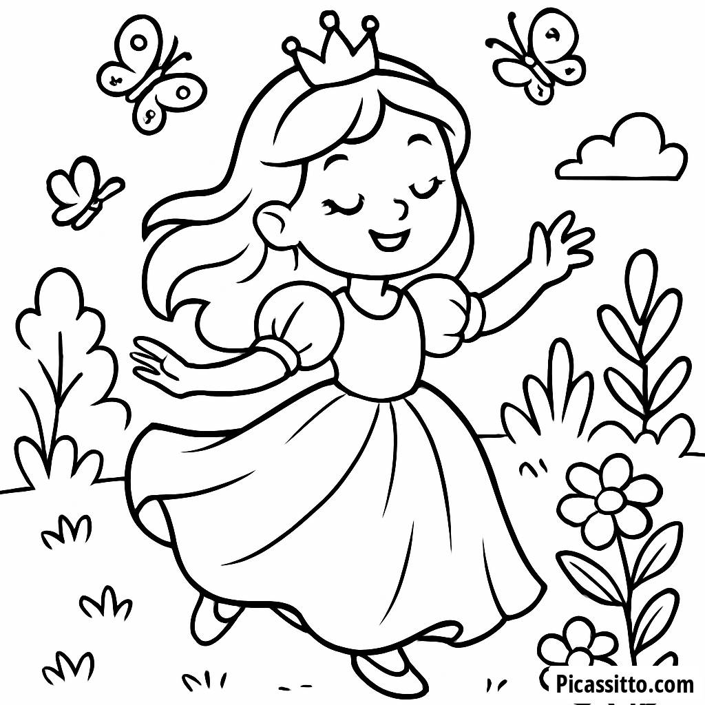 Scarica questa pagina da colorare della principessa incantevole, gratuita e stampabile, dove danza in un giardino magico circondata da farfalle!