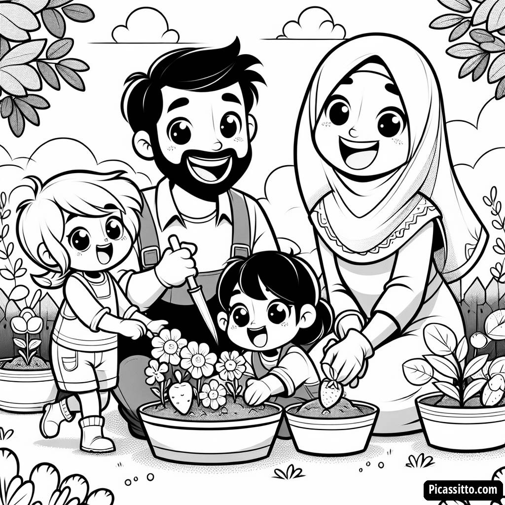 Goditi questa pagina da colorare gratuita e stampabile della famiglia in giardino, con una deliziosa scena di piantare fiori e verdure insieme!