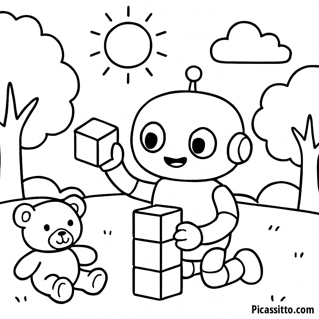 Scarica questa pagina da colorare gratuita e stampabile di un robot amichevole che costruisce una torre con blocchi colorati in un parco soleggiato. Perfetta per stimolare la creatività dei bambini!