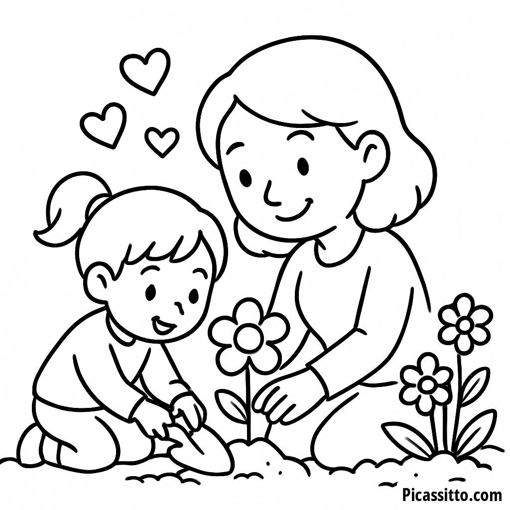 Goditi questa pagina da colorare gratuita e stampabile che raffigura una madre e un bambino che piantano fiori insieme in un giardino, con cuori che fluttuano sopra. Perfetta per celebrare la Festa della Mamma!