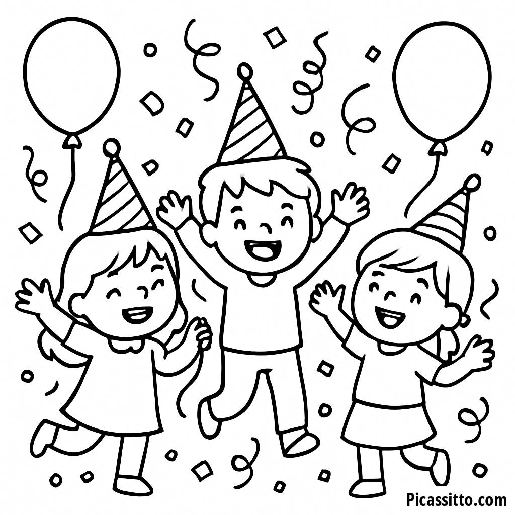 Scarica e stampa questa gratuita pagina da colorare di Celebrazione di Capodanno con bambini in cappelli da festa, palloncini e coriandoli! Perfetta per il divertimento festivo!