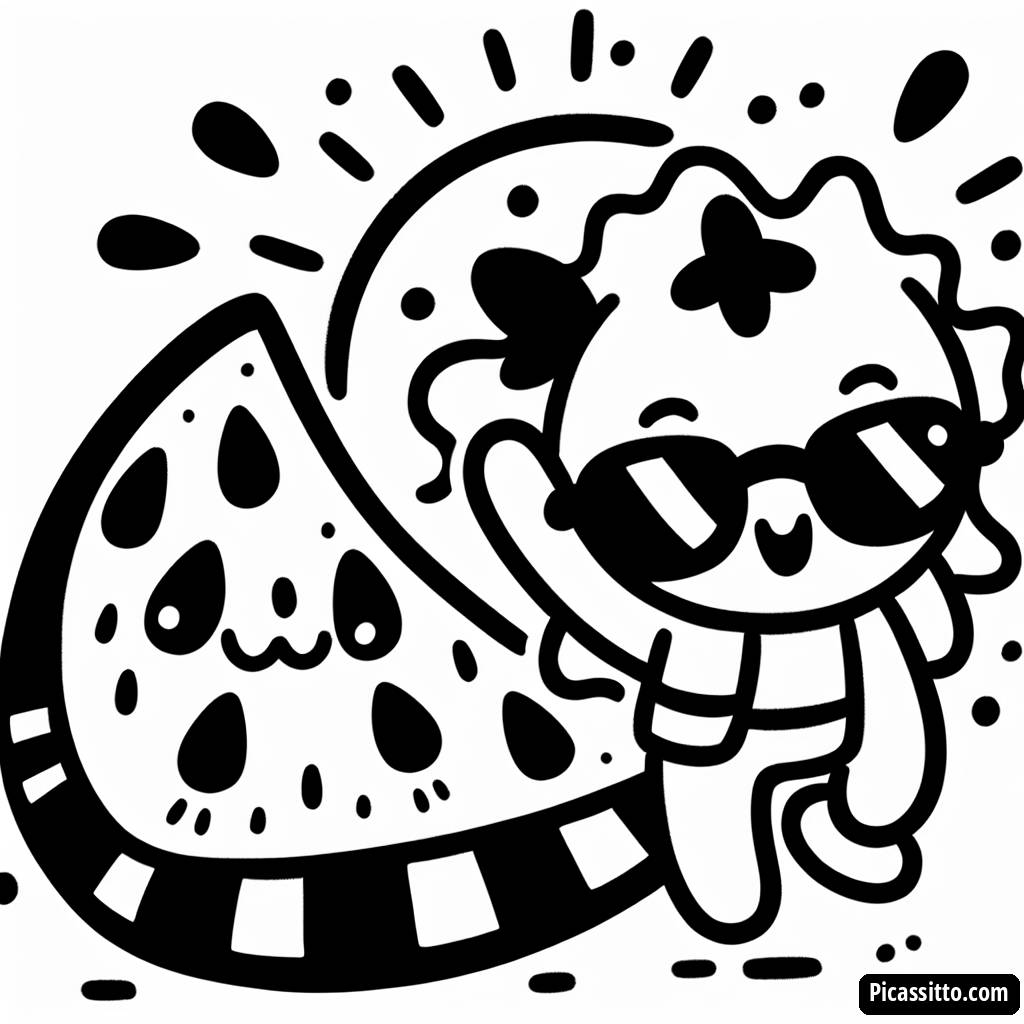 Divertiti con questa pagina da colorare gratuita e stampabile che presenta una fetta di anguria giocosa con semi e un adorabile sole con occhiali da sole. Perfetta per i bambini creativi!