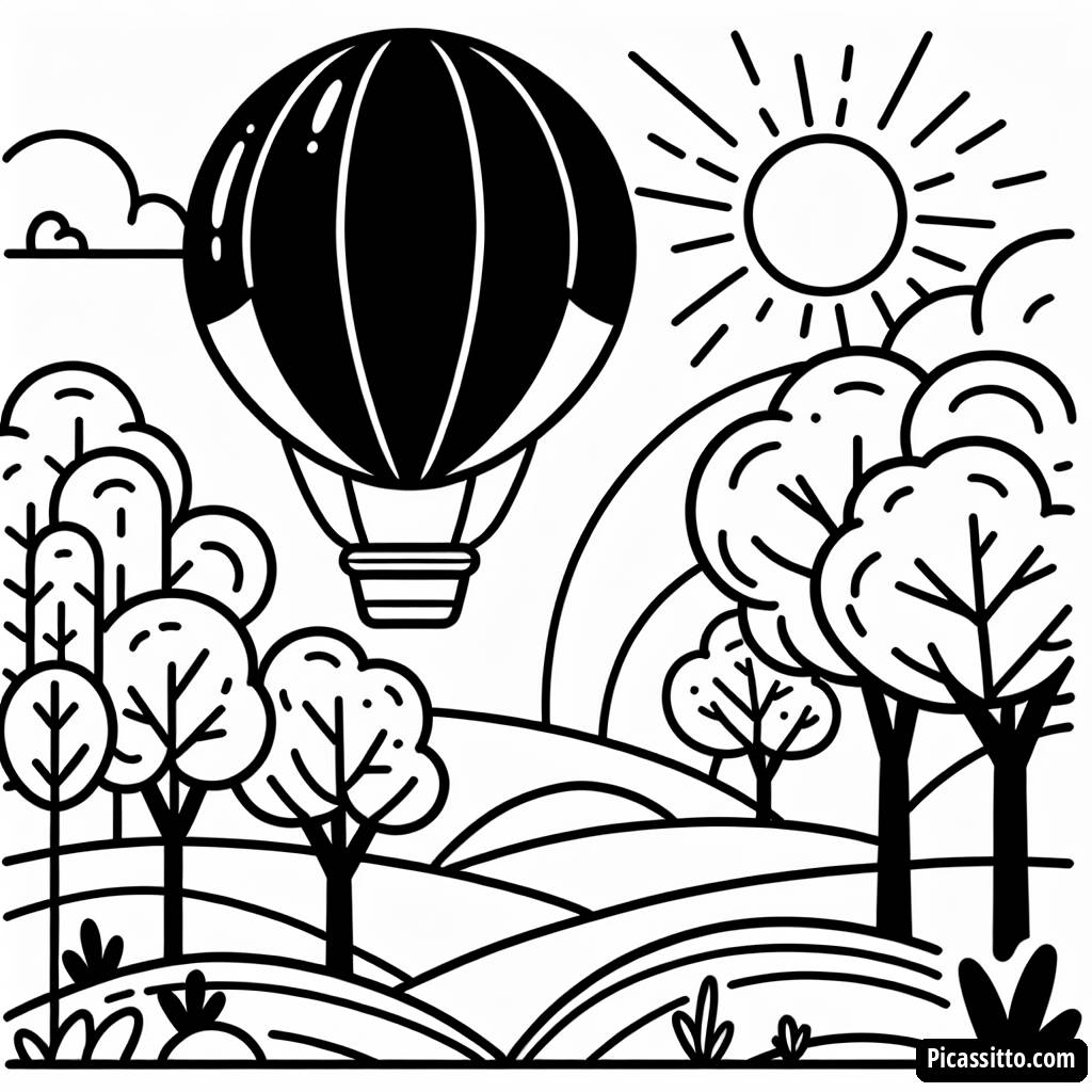 Pagina da Colorare con Pallone Aerostatico in un Paesaggio Soleggiato