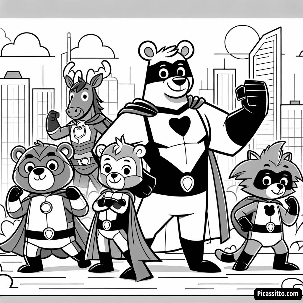 Libera la tua creatività con questa pagina da colorare gratuita e stampabile dei supereroi animali, che presenta una squadra di animali unici pronti a salvare la situazione!