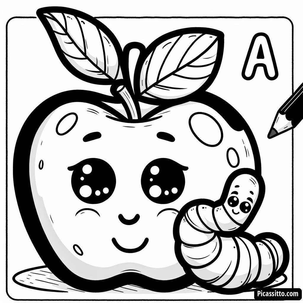Aproveite esta página para colorir gratuita e imprimível: A é de Maçã, com um lindo verme sorridente espiando! Perfeita para os pequenos aprendizes.