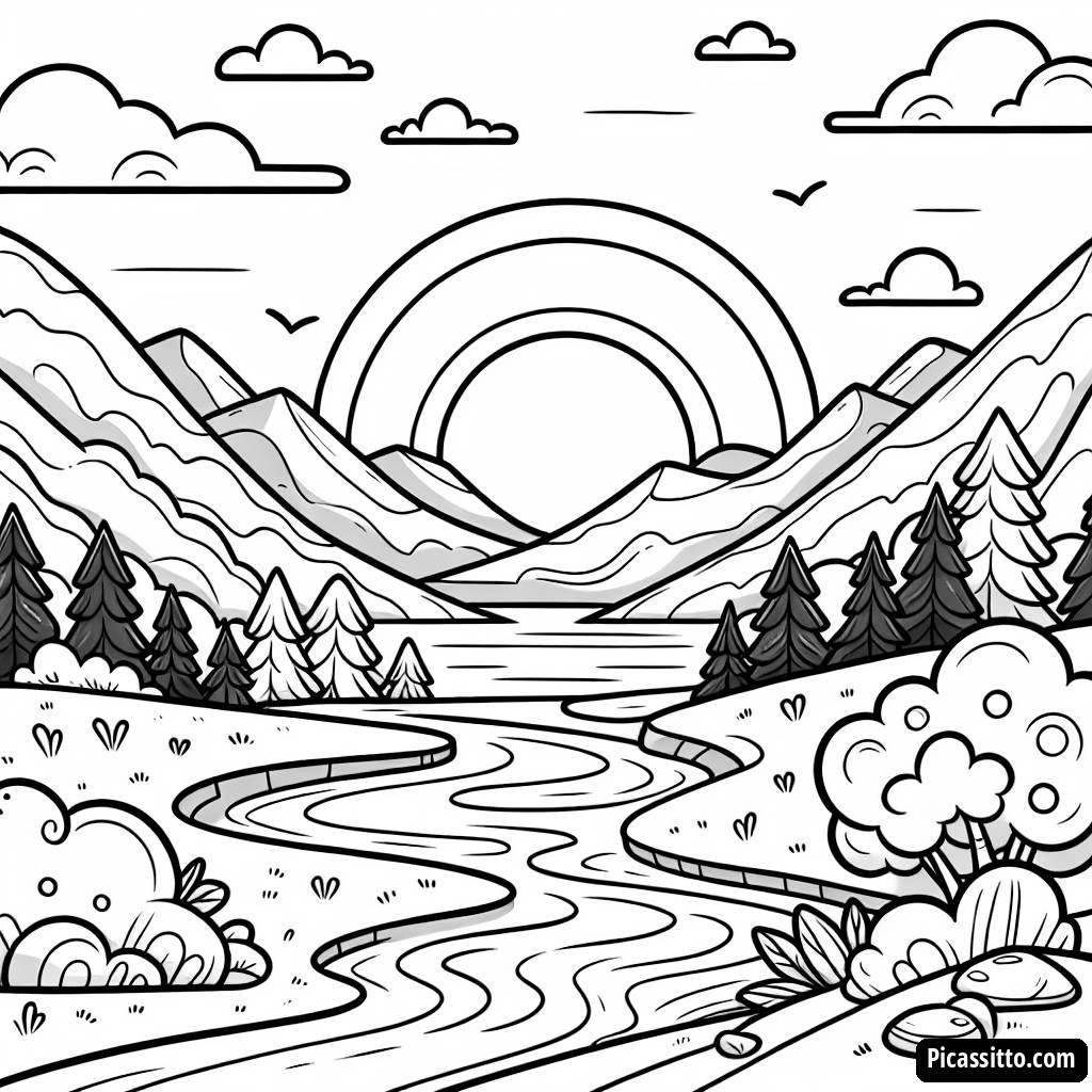 Aproveite esta página para colorir gratuita e imprimível que apresenta um lindo pôr do sol sobre montanhas onduladas e um rio sinuoso. Perfeita para despertar a criatividade nas crianças!
