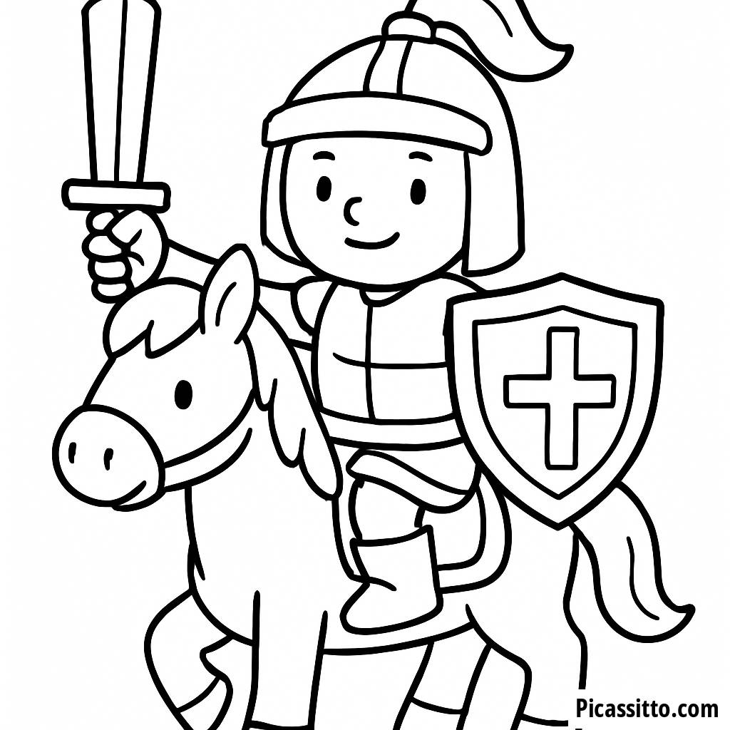 Baixe esta página para colorir gratuita e imprimível com um valente cavaleiro em um cavalo, pronto para a aventura com sua espada e escudo.