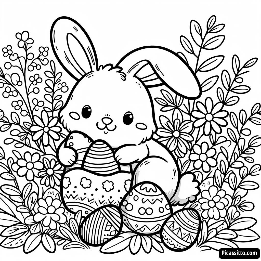 Baixe esta página para colorir gratuita de um coelhinho feliz escondendo ovos coloridos atrás de flores em flor, perfeita para a diversão da Páscoa!