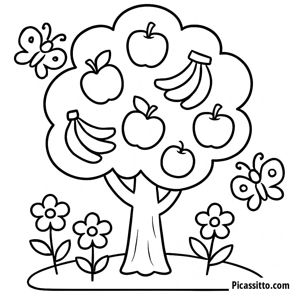 Baixe esta página para colorir gratuita e imprimível da árvore frutífera alegre com maçãs, bananas, borboletas e flores para uma diversão sem fim!