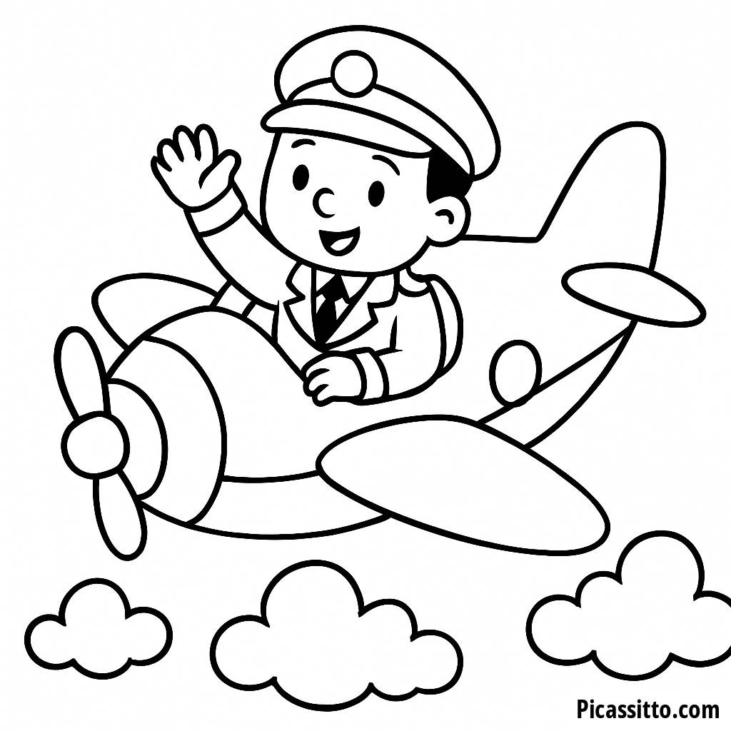 Deixe a imaginação do seu filho voar com esta página para colorir gratuita e imprimível de um piloto alegre em um avião colorido acima de nuvens fofas!