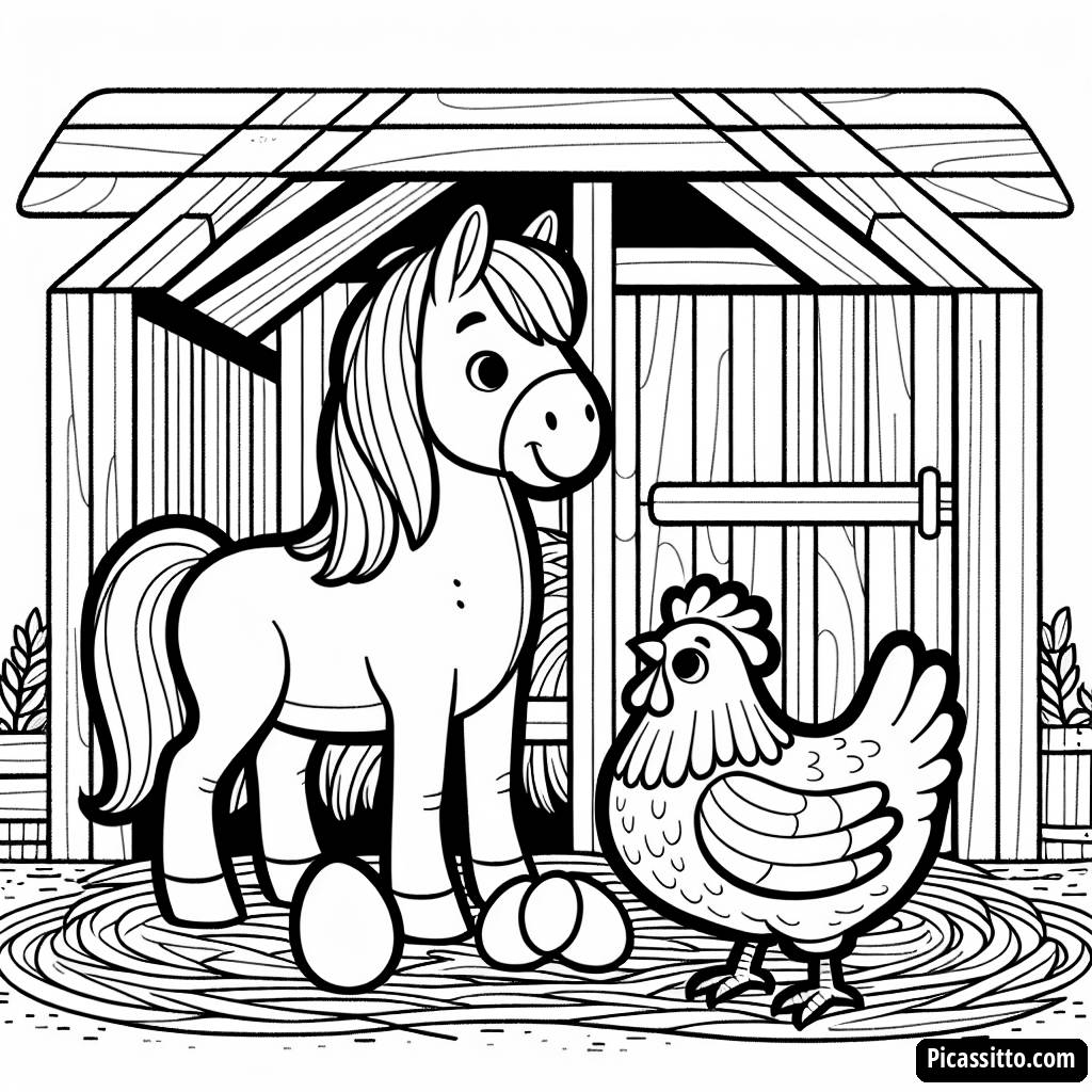 Aproveite esta página para colorir gratuita e imprimível, apresentando um cavalo curioso ao lado de uma galinha sentada sobre seus ovos em um aconchegante estábulo. Perfeita para pequenos artistas expressarem sua criatividade!