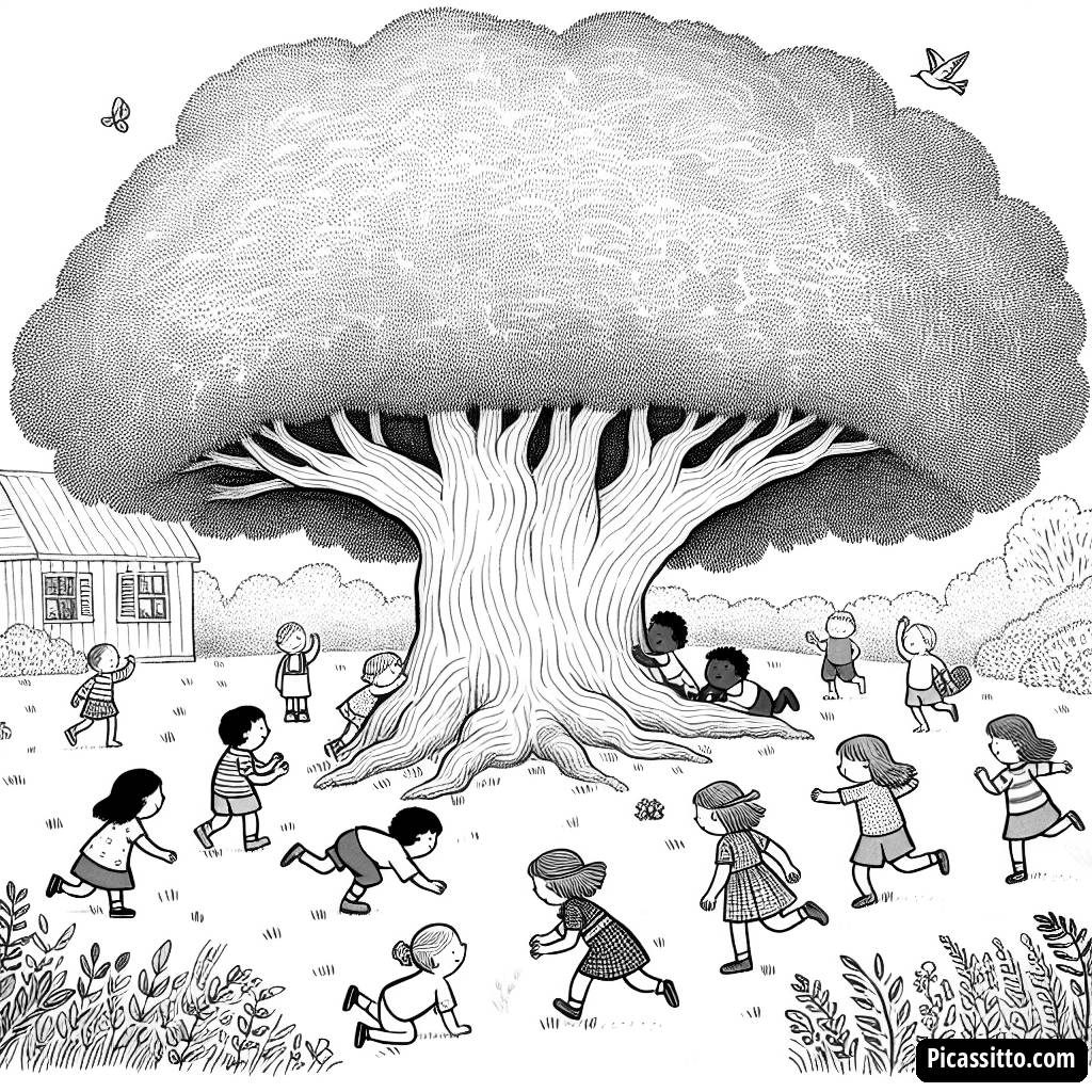Baixe esta página para colorir gratuita e imprimível de crianças brincando de esconde-esconde ao redor de uma grande árvore no quintal. Perfeita para uma divertida atividade em família!