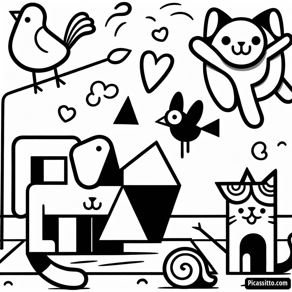 Baixe esta página para colorir gratuita e imprimível de Animais Divertidos com Formas, apresentando um cachorro quadrado, um gato circular e um pássaro triangular para horas de diversão criativa!