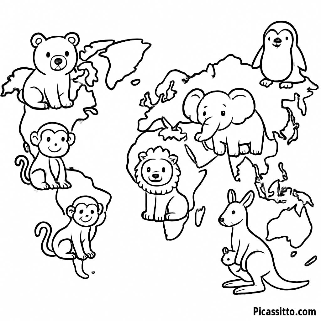 Explore os continentes com nossa página para colorir do mapa mundial, gratuita e imprimível, com ícones de animais divertidos para cada região!