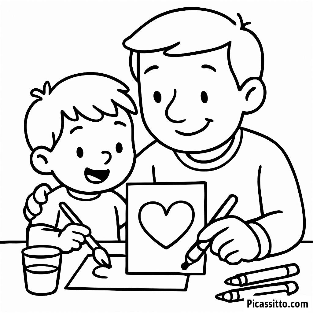 Aproveite esta página para colorir gratuita e imprimível que apresenta um pai e filho pintando juntos um cartão colorido, perfeita para comemorar o Dia dos Pais!