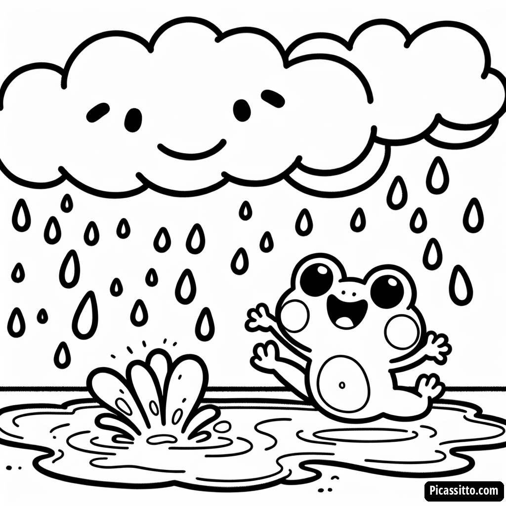 Aproveite esta página para colorir gratuita e imprimível com um sapo fofo pulando em uma poça sob gotas de chuva de nuvens fofinhas!