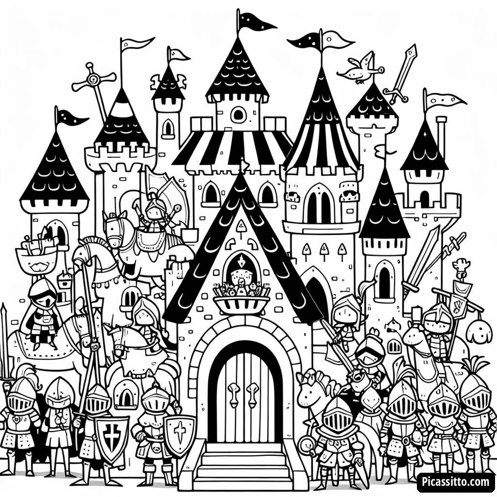 Baixe esta página para colorir gratuita e imprimível, que apresenta cavaleiros se preparando para um grande banquete em um majestoso castelo. Deixe sua criatividade brilhar enquanto dá vida a esta cena medieval!