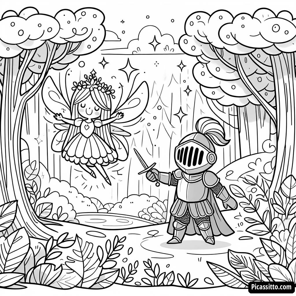 Explore o mundo encantador de uma floresta mágica com nossa página de colorir gratuita que apresenta uma fada e um cavaleiro heroico. Perfeita para estimular a criatividade nas crianças!