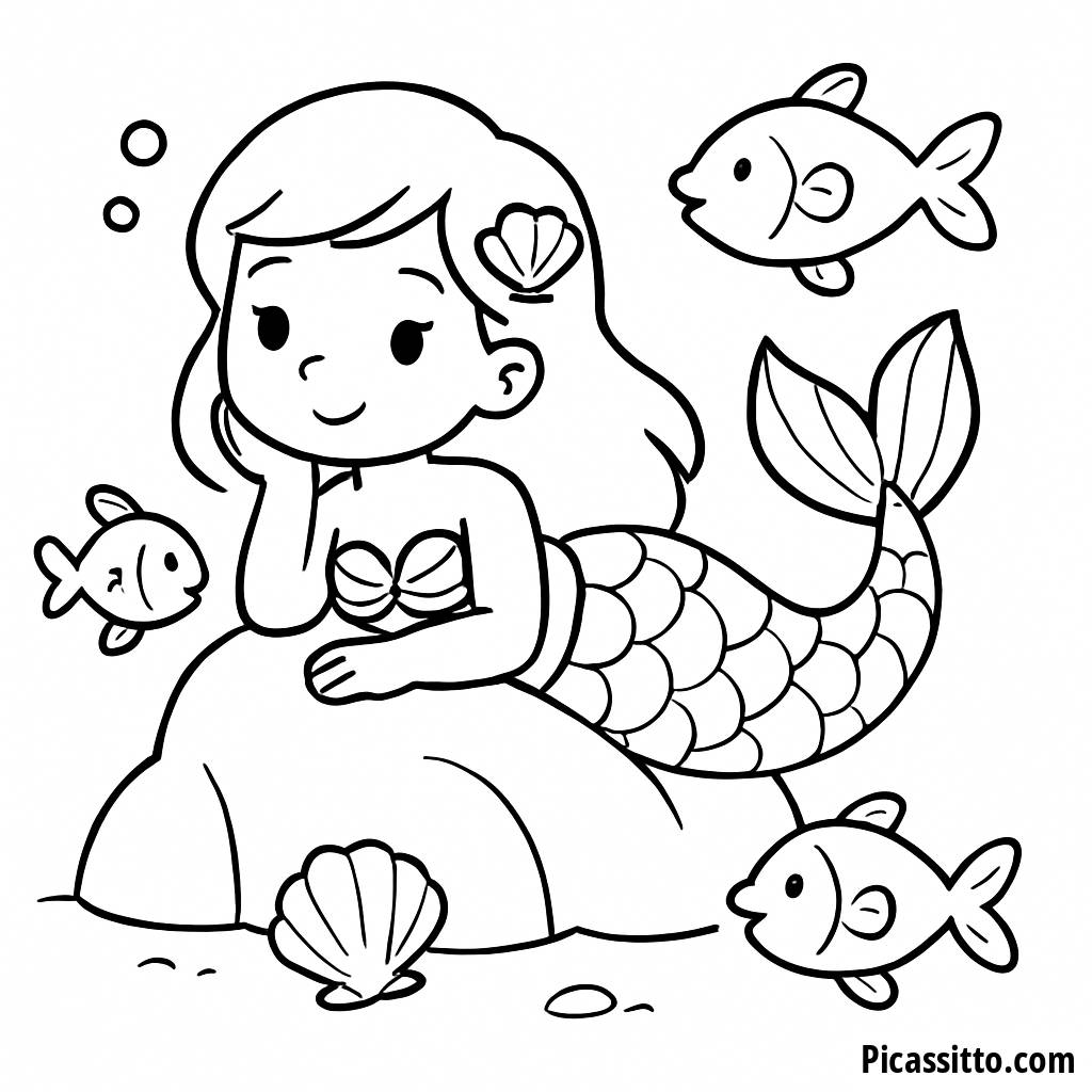 Aproveite esta página para colorir de sereia, gratuita e imprimível, que apresenta uma linda sereia relaxando em uma rocha cercada por peixes brincalhões e conchas. Perfeita para inspirar a criatividade nas crianças!
