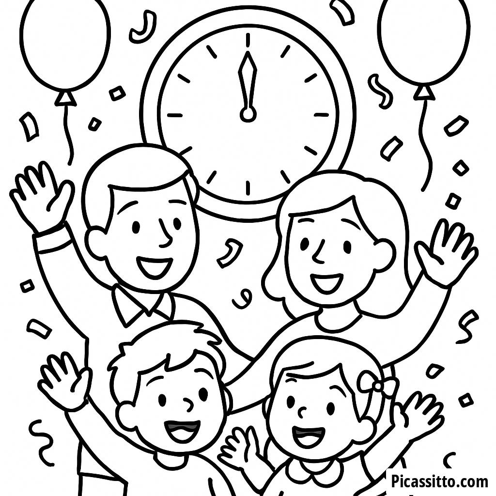 Celebre o Ano Novo com esta divertida e gratuita página para colorir, apresentando uma família alegre a comemorar com confetes e balões à meia-noite!