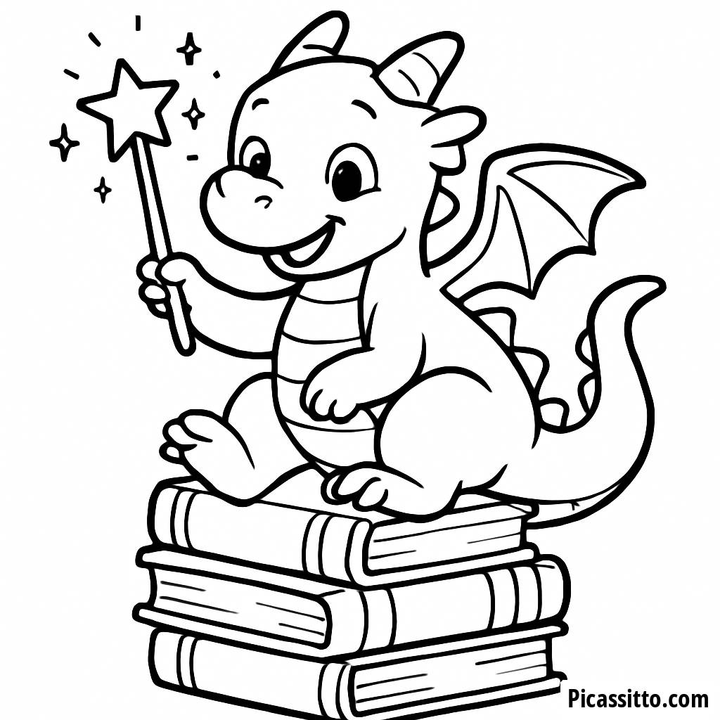 Liberte sua criatividade com esta página para colorir gratuita e imprimível de um dragão brincalhão, empoleirado em uma pilha de livros de feitiços coloridos e uma varinha cintilante!