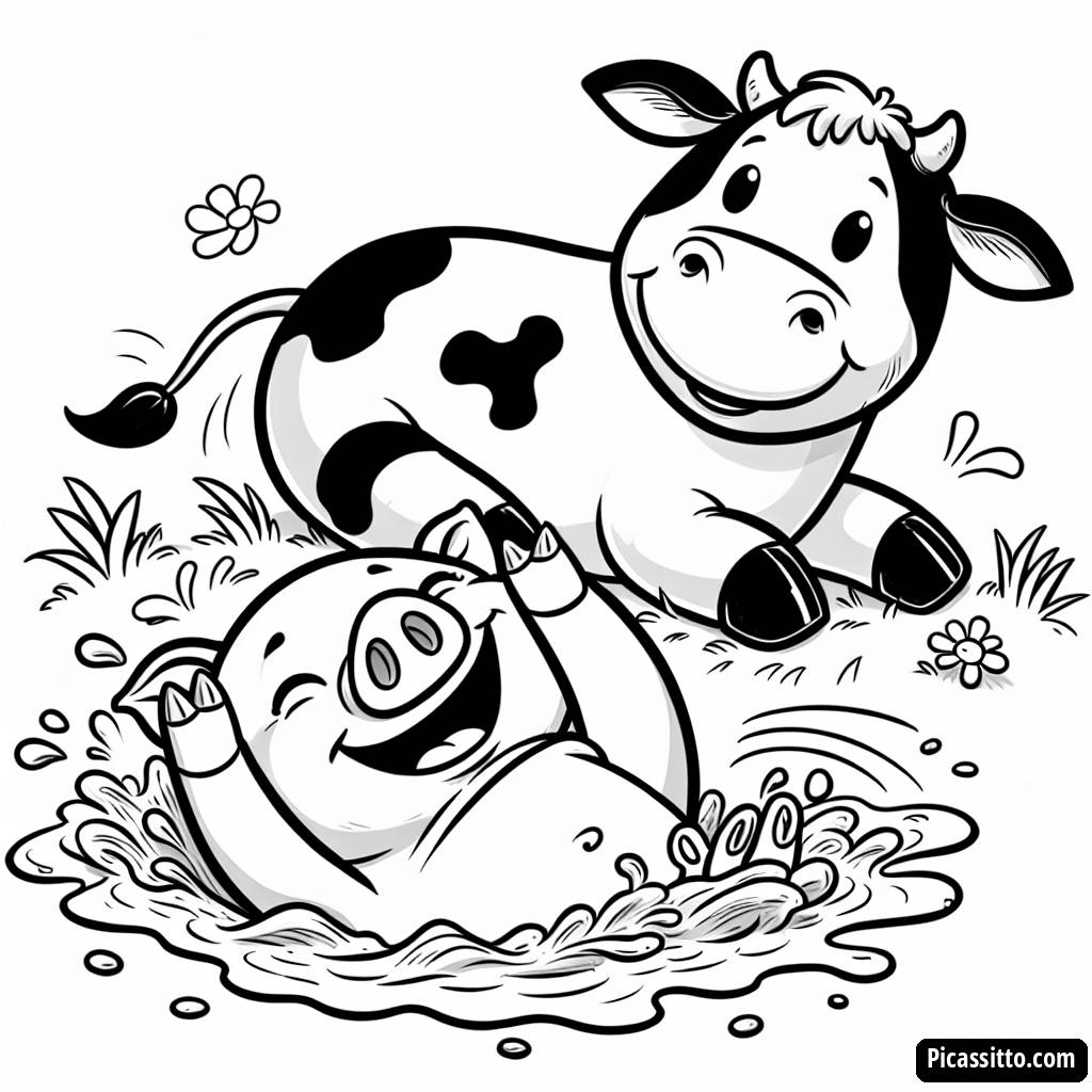 Aproveite esta página para colorir gratuita e imprimível com um porquinho brincalhão rolando na lama ao lado de uma vaca feliz pastando no campo. Perfeito para os amantes de animais de fazenda!