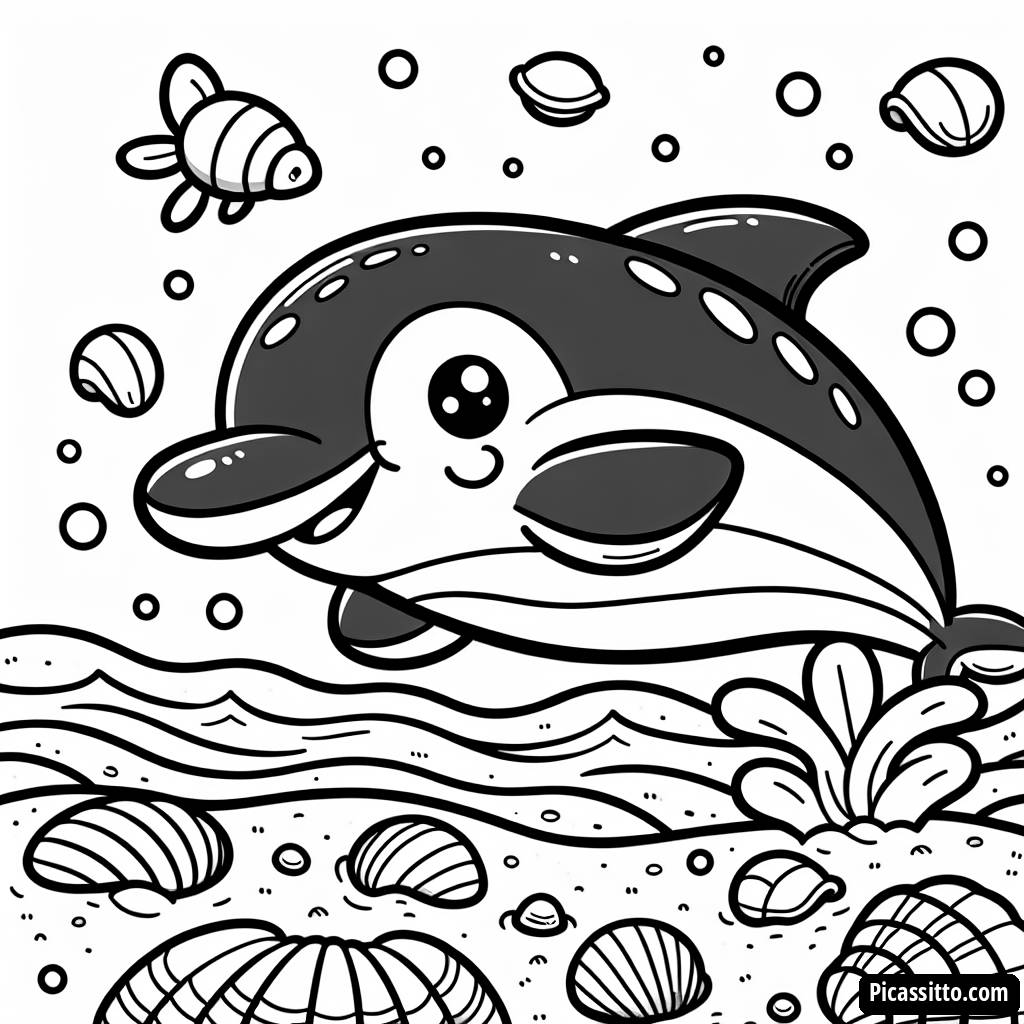 Aproveite um dia ensolarado na praia com esta página para colorir gratuita e imprimível, que apresenta conchas e um golfinho brincalhão saltando nas ondas!
