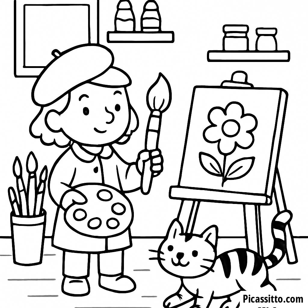 Baixe esta página para colorir gratuita e imprimível do estúdio de arte fantástico, cheia de pincéis, telas e um gato brincalhão. Perfeita para estimular a criatividade!