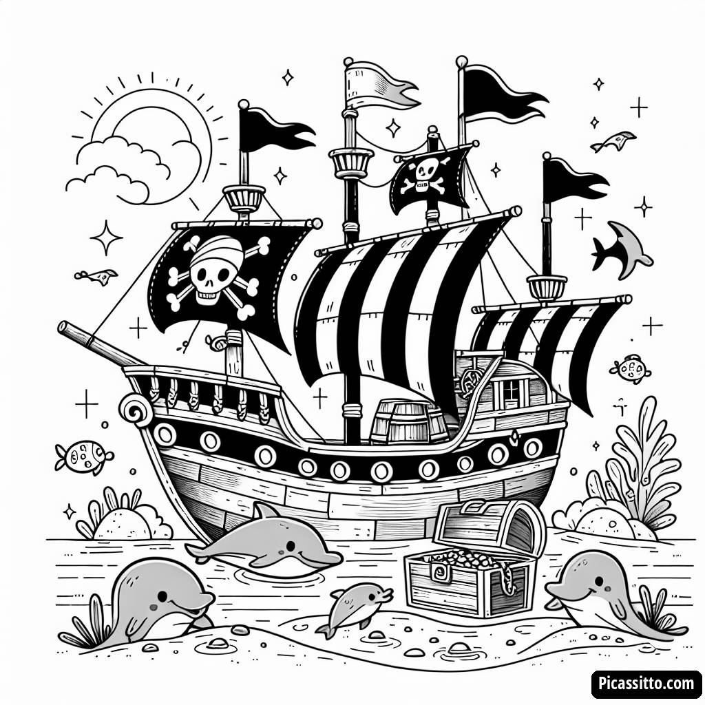Отправляйтесь в приключение с нашей бесплатной и распечатываемой раскраской пиратского корабля, с флагами, сундуком с сокровищами и дружелюбными морскими существами!