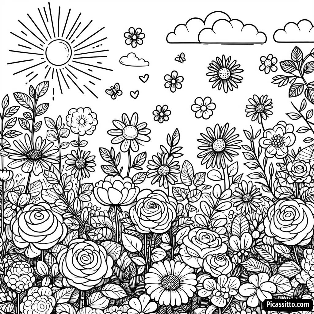 Скачайте эту бесплатную иPrintable раскраску с ярким садом, наполненным розами, подсолнухами и ромашками под солнечным небом!