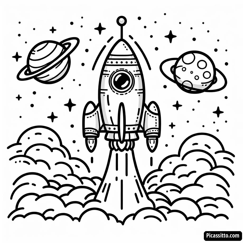 Скачайте эту бесплатную и распечатываемую раскраску ракеты, на которой изображена элегантная ракета, взлетающая в космос с облаками дыма и далекими планетами! Идеально для маленьких астронавтов!