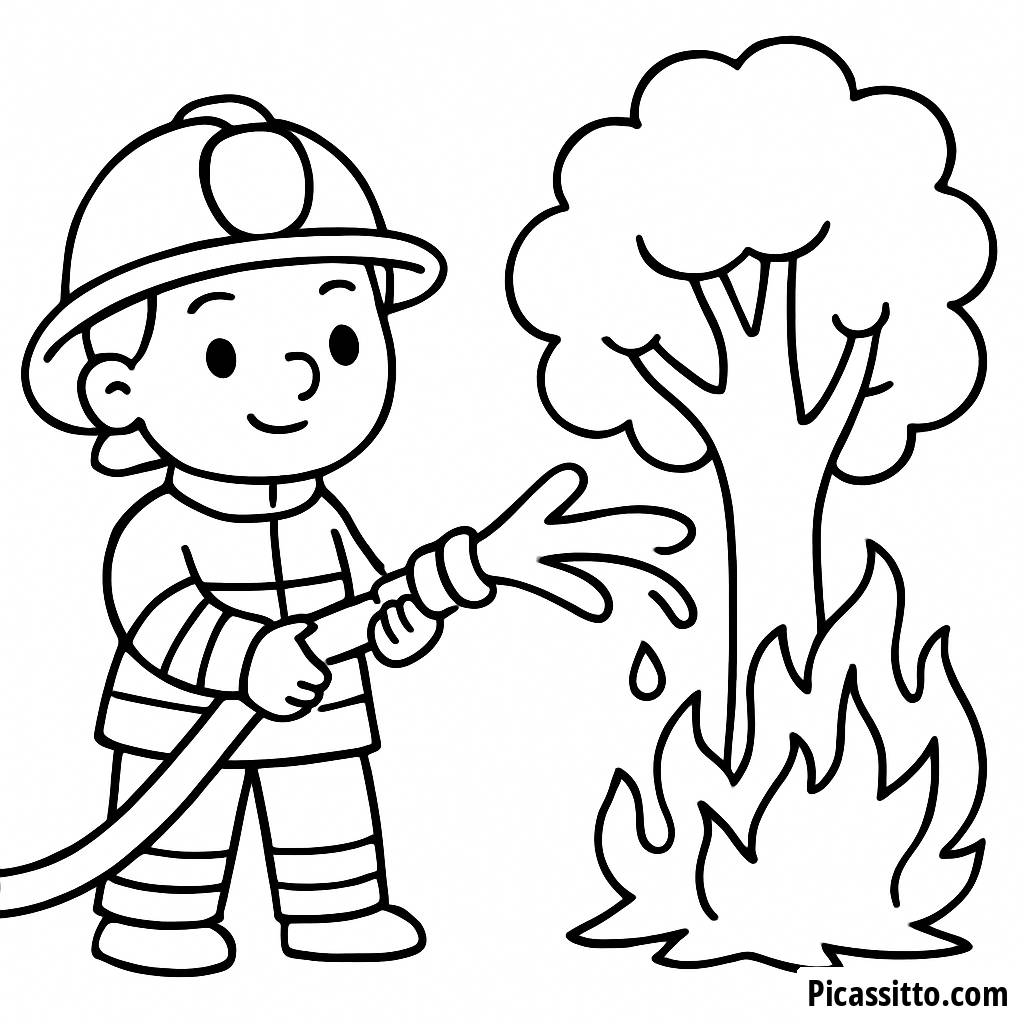 Скачайте эту бесплатную раскраску смелого пожарного, где дети могут раскрашивать героя, поливающего дерево, чтобы потушить пламя!