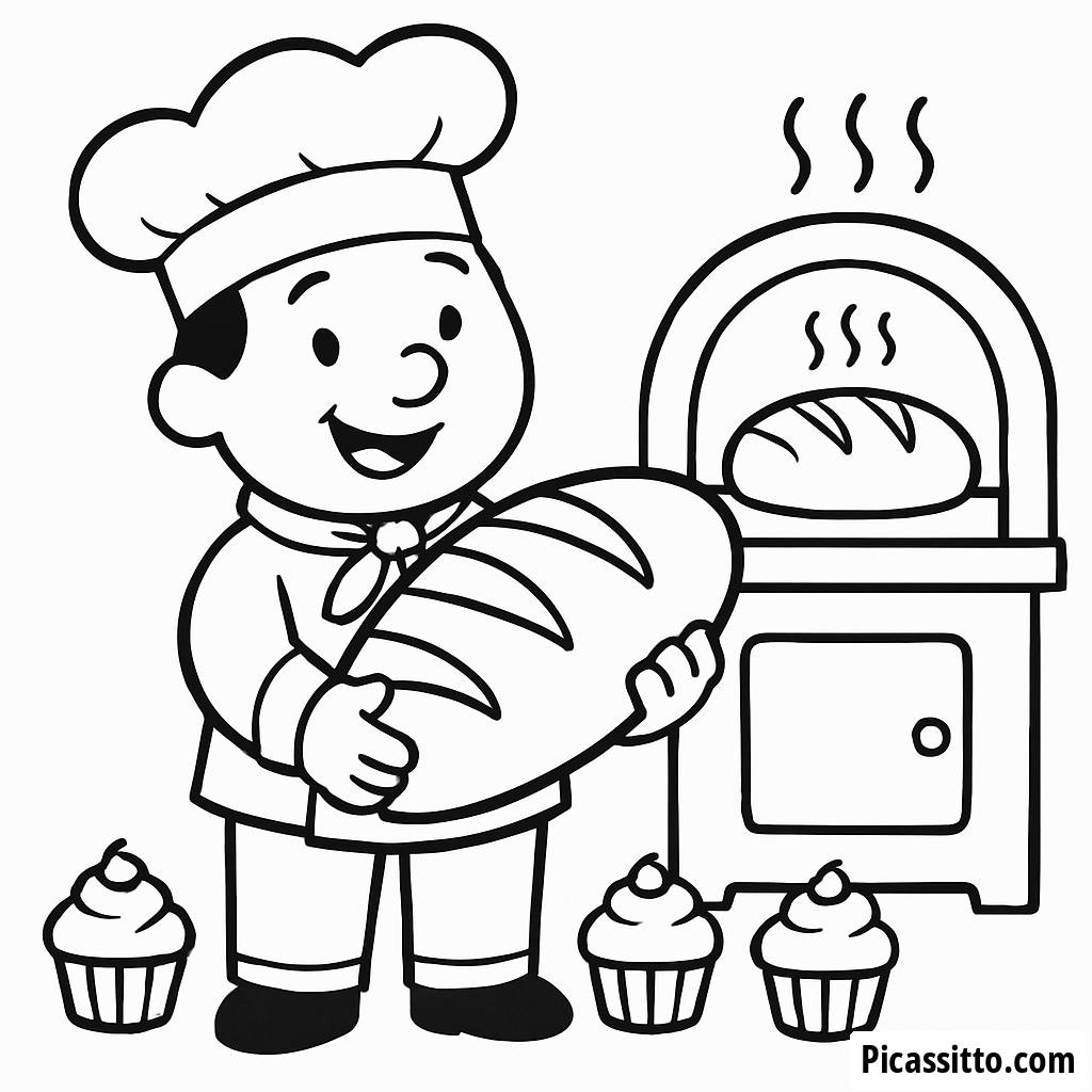 Наслаждайтесь этой бесплатной и печатной раскраской с веселым пекарем, держащим гигантский хлеб, окруженным вкусными кексовыми и теплой печью!