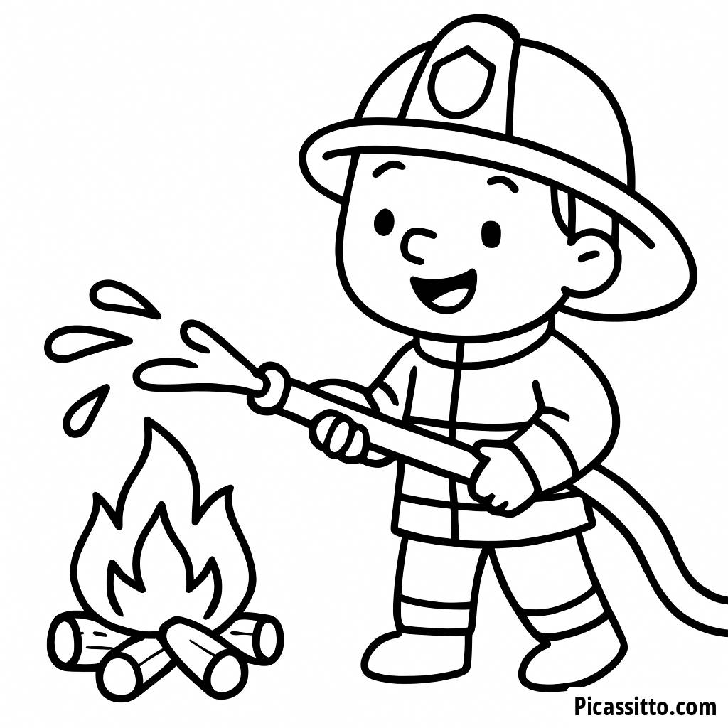 Скачайте эту бесплатную и распечатываемую раскраску с веселым пожарным, который поливает водой небольшой костер. Идеально для детей, которые любят героев и приключения!