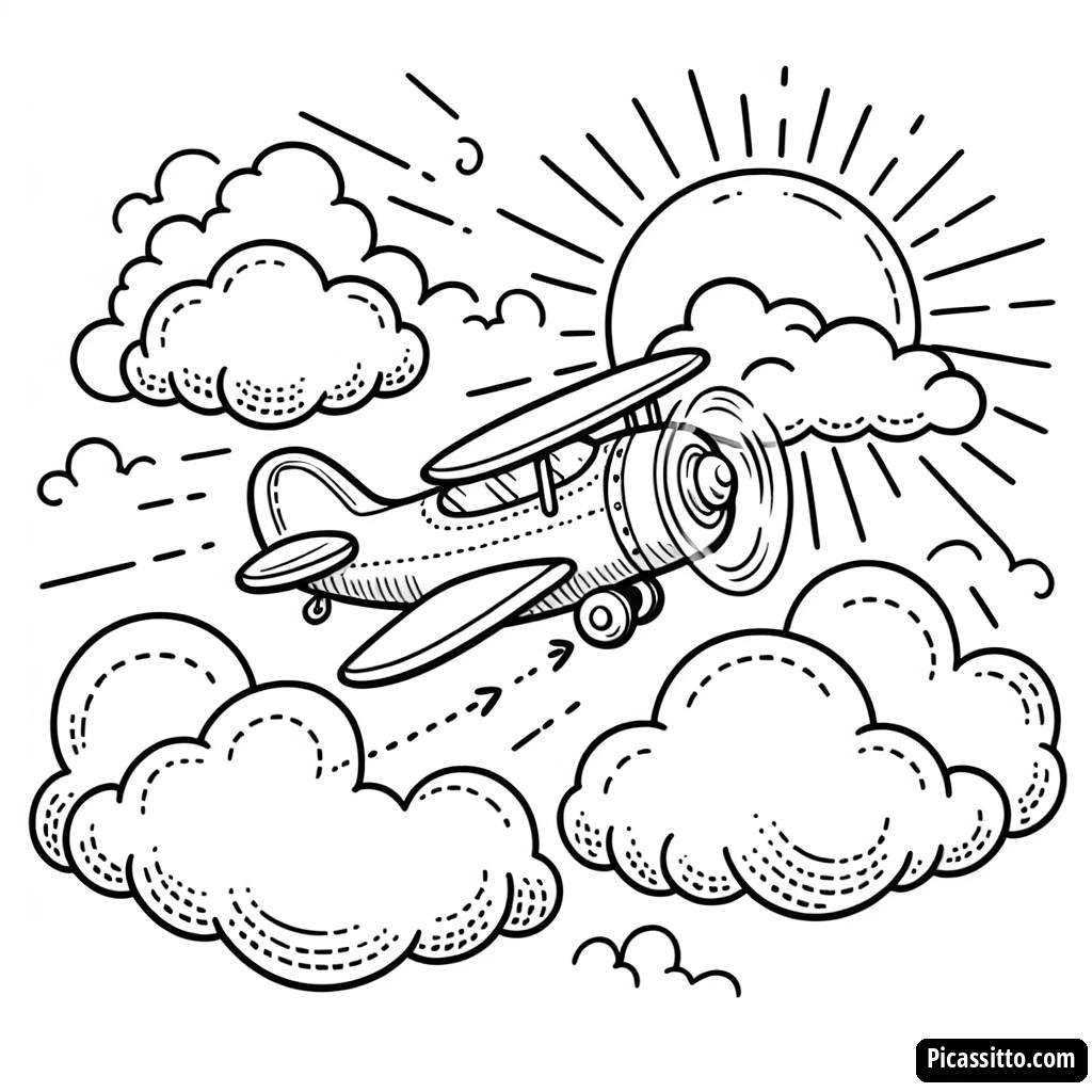 Скачайте эту бесплатную раскраску дружелюбного самолета, который летит над пушистыми облаками с улыбающимся солнцем. Идеально для маленьких авиамоделистов!