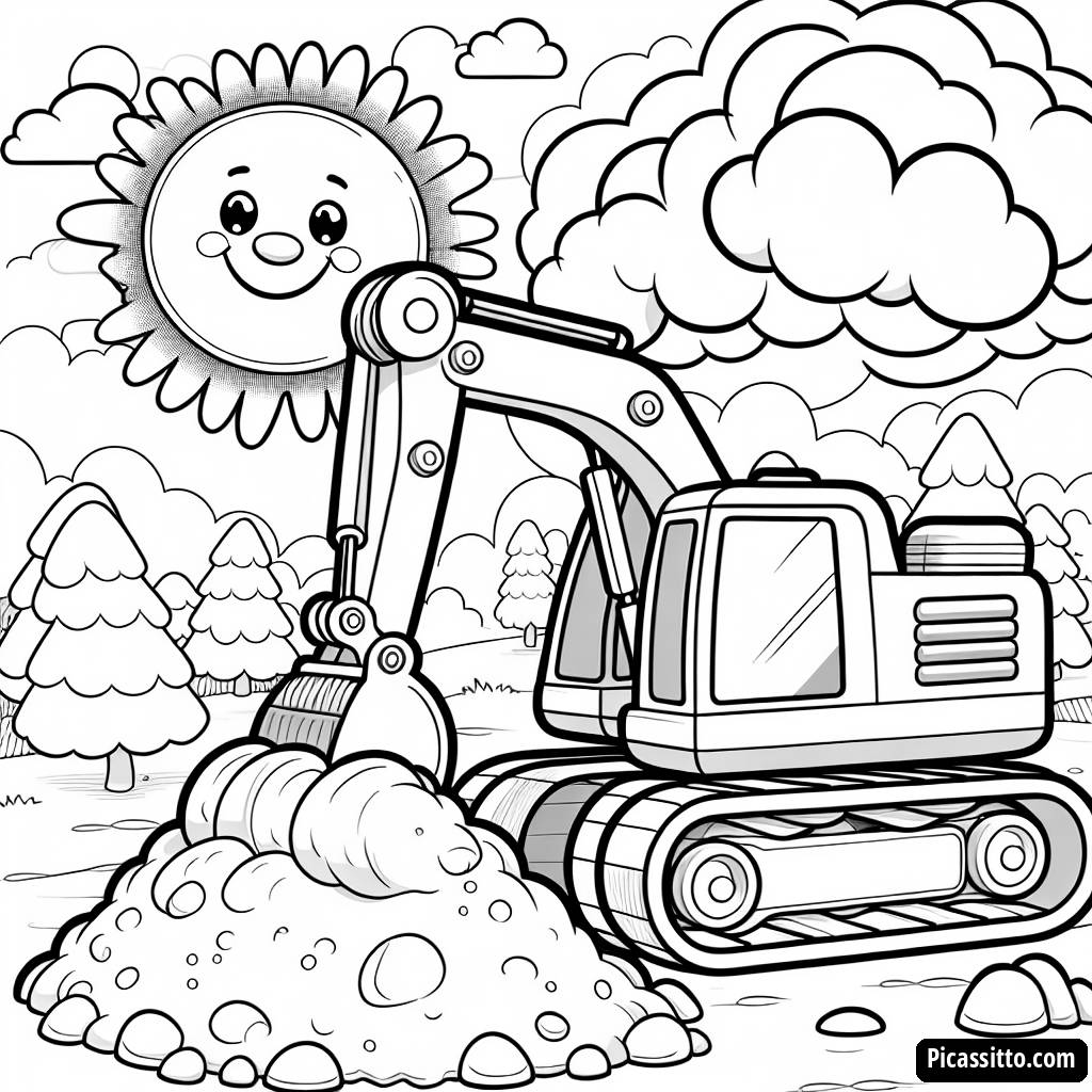 Скачайте эту бесплатную и распечатываемую раскраску с дружелюбным экскаватором, копающим большую кучу песка под улыбающимся солнцем. Идеально подходит для маленьких любителей строительства!