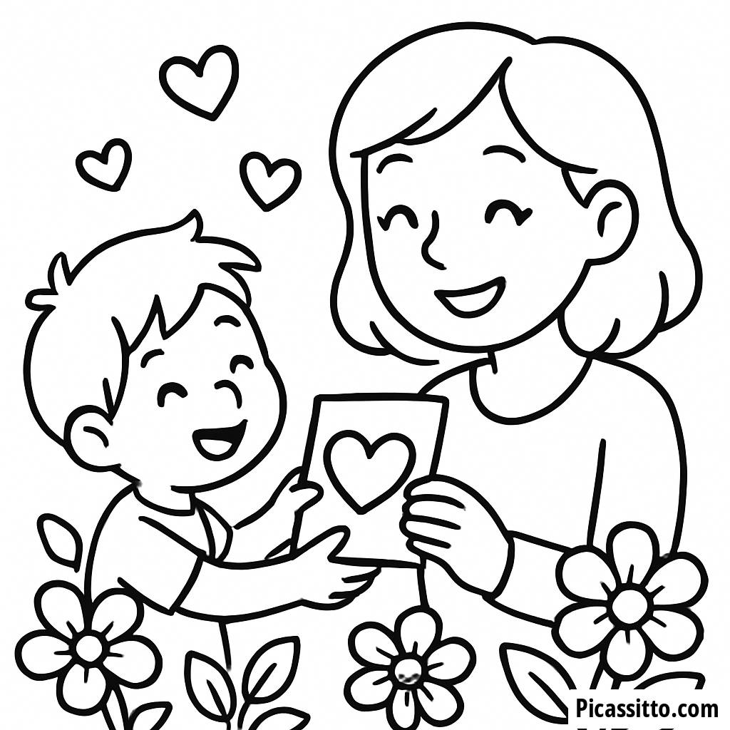 Отпразднуйте День Матери с этой бесплатной и распечатываемой картинкой для раскрашивания, на которой ребенок вручает маме улыбающейся handmade открытку, окруженной цветущими цветами и сердцами.