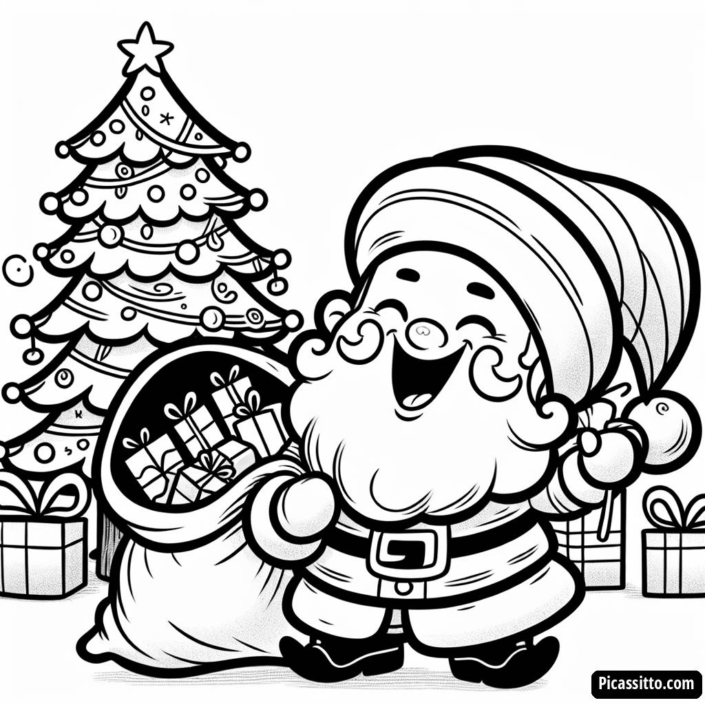 Погрузитесь в дух праздника с этой бесплатной раскраской с Сантой, смеющимся и держащим мешок подарков, идеальной для детей всех возрастов!