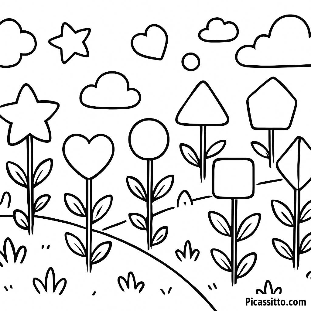 Исследуйте чудеса волшебного сада, наполненного цветами в форме звезд, сердец и геометрических фигур. Эта раскраска бесплатна и доступна для печати, чтобы вы могли наслаждаться бесконечным весельем!