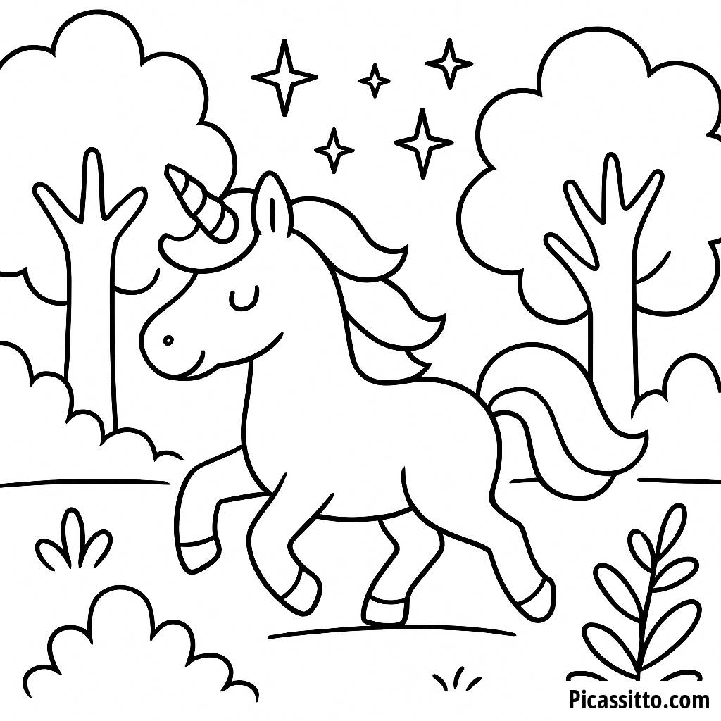 Скачайте эту бесплатную раскраску магического единорога, на которой изображен единорог, скачущий по волшебному лесу под мерцающими звездами. Идеально для раскрытия творческих способностей!