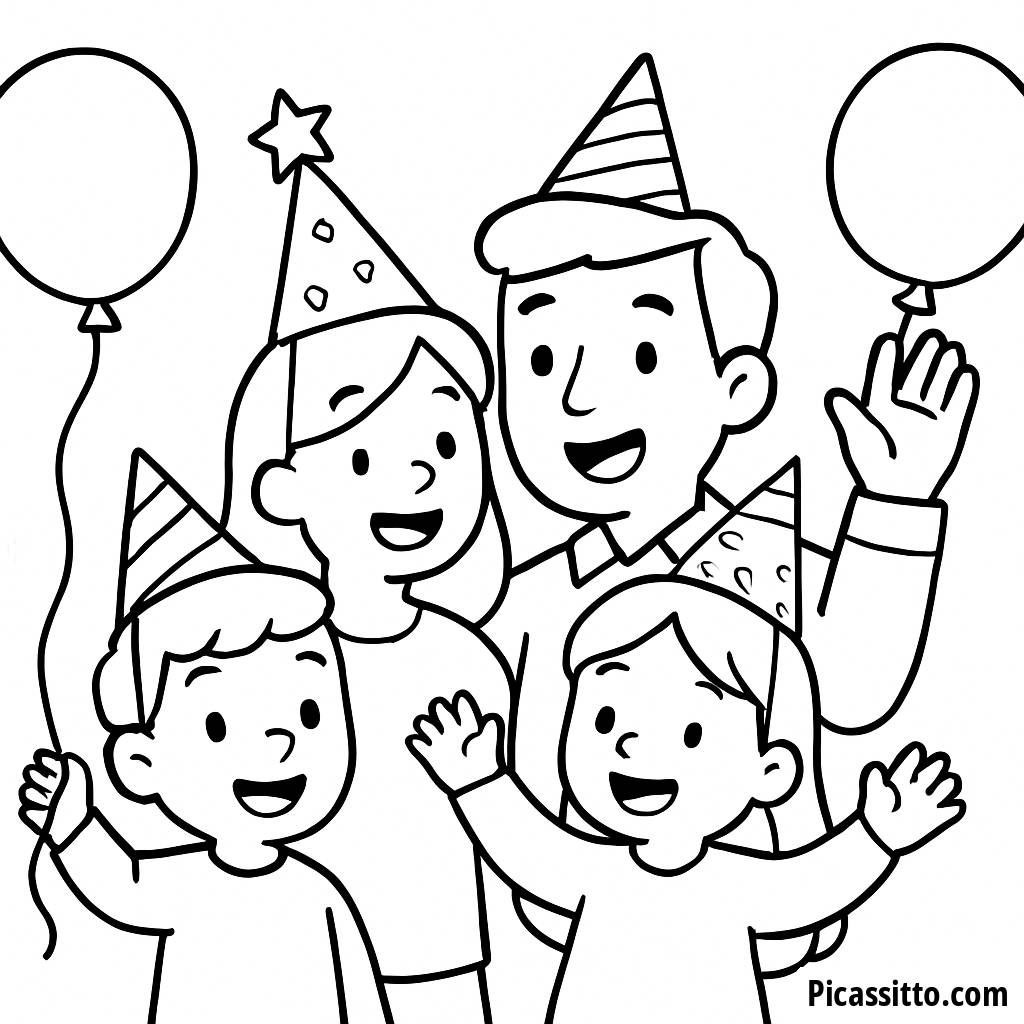 Отпразднуйте Новый год с этой веселой раскраской, где счастливая семья считает до полуночи с воздушными шарами и новогодними колпаками!