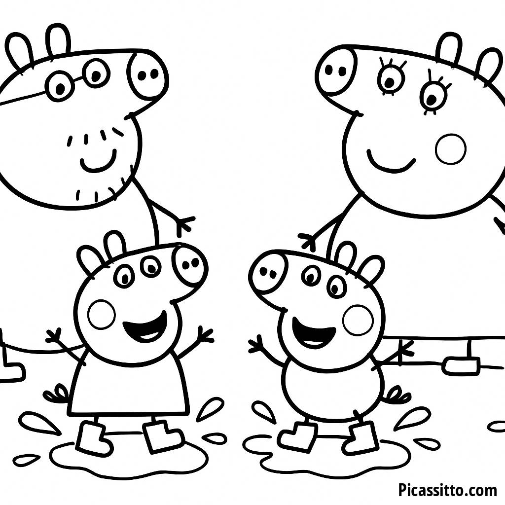 Наслаждайтесь этой бесплатной и распечатываемой раскраской Пеппы и Джорджа, прыгающих в грязевых лужах, пока Мама Пиг и Папа Пиг смотрят. Идеально подходит для веселого занятия раскрашиванием!