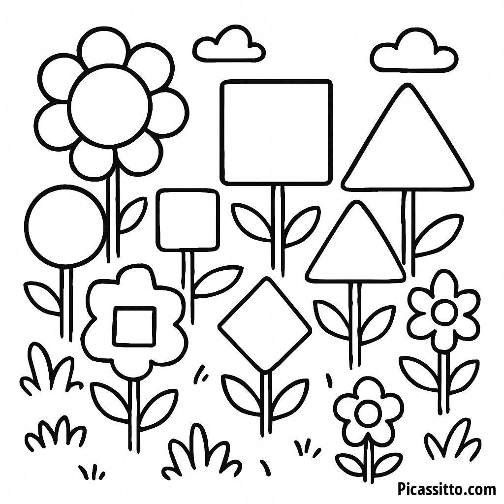 Исследуйте творчество с этой бесплатной и распечатываемой раскраской игривого сада форм, featuring colorful flowers in fun geometric shapes. Идеально подходит для детей, чтобы наслаждаться и изучать формы во время раскрашивания!