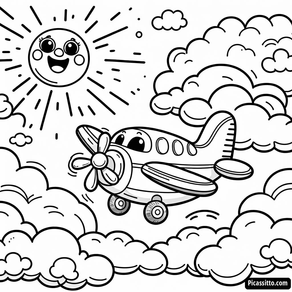 Скачайте эту бесплатную и распечатываемую раскраску с радостным самолетом, летящим над пухлыми облаками и улыбающимся солнцем. Идеально для маленьких летчиков!